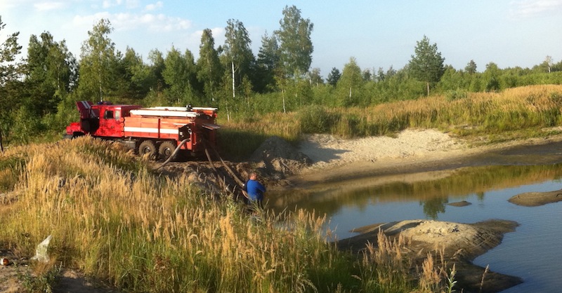 Огнеборцы уничтожают отдельные очаги пламени и качают воду из пруда (раньше вода была выше примерно на метр)