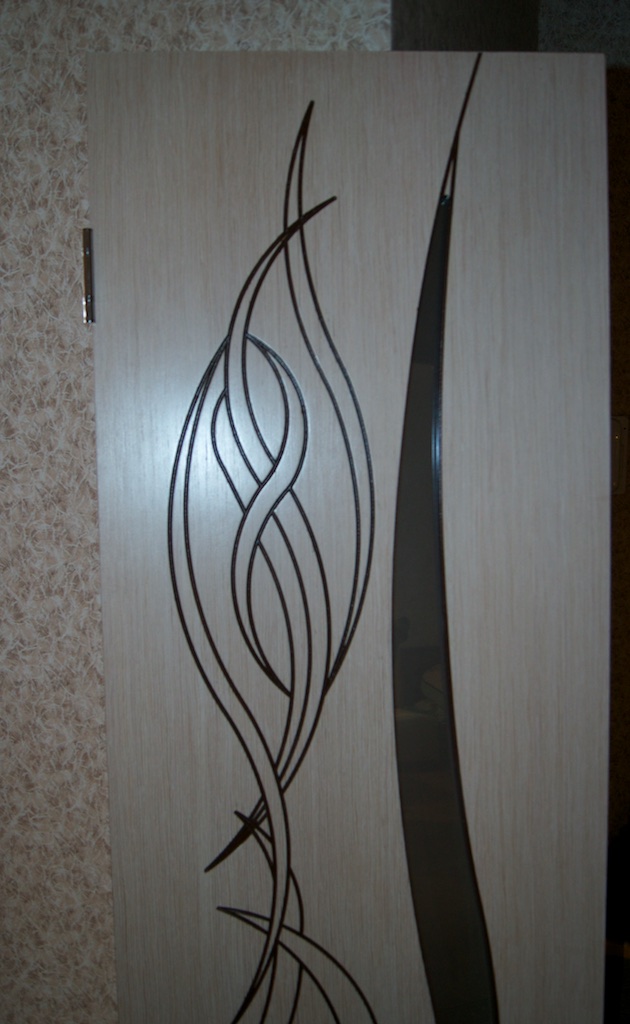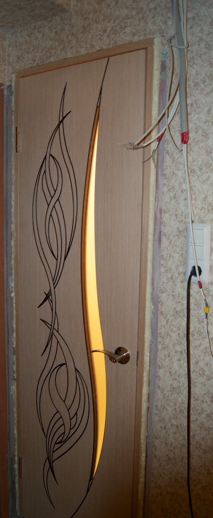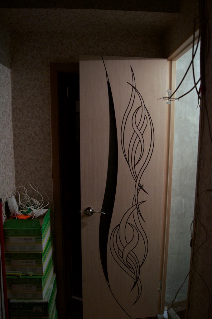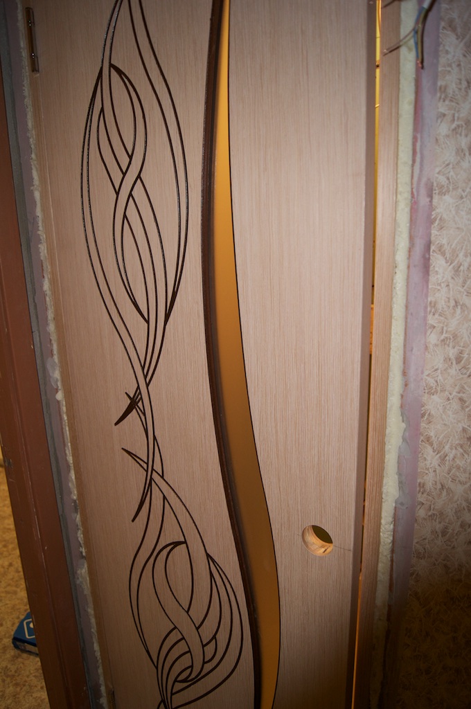 Вырезал дырку под замок и замок, собственно, поставил. Кстати, почему-то на фото дверь выходит желтоватой, а ручка - золотистой. На самом деле, цвет двери - беленый дуб, а ручка - хром :)