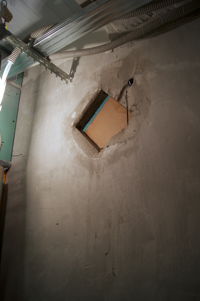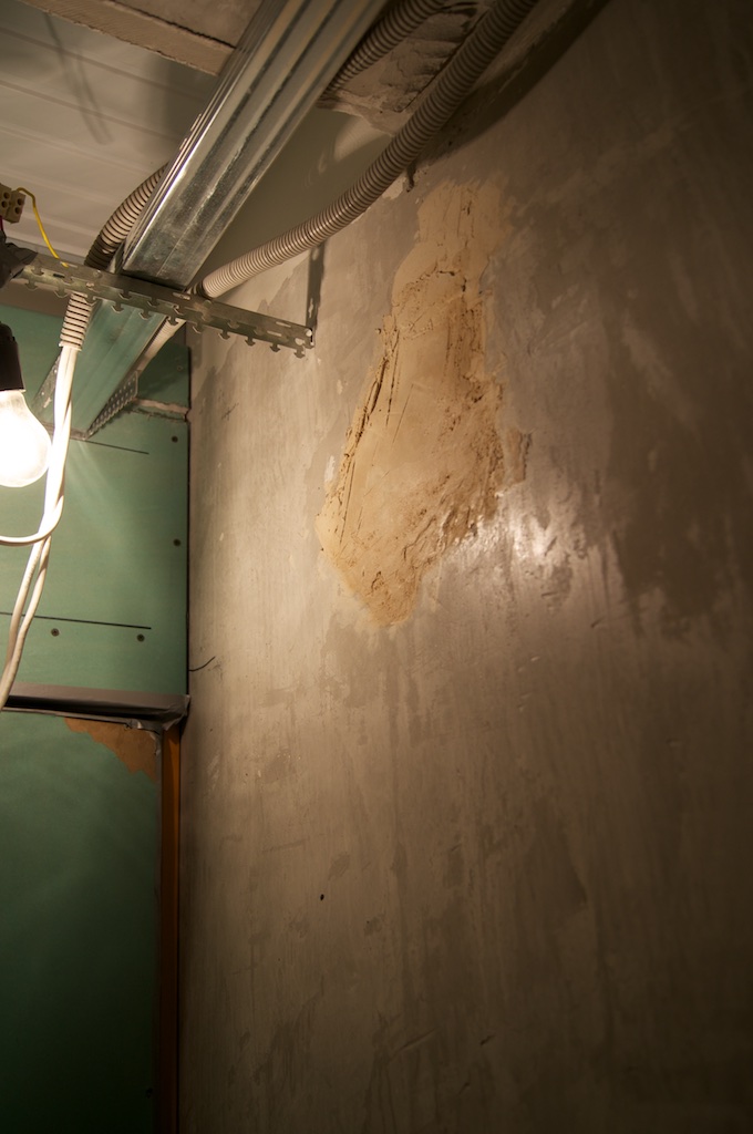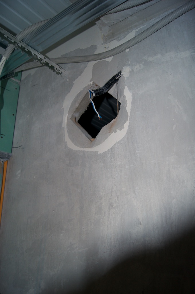 Наконец-то пришло время снять старый светильник! Светильник снял, под ним обнаружилась деревяшка. Попытался ее выковырять и получил незапланированное окно в ванную. Несмотря на соблазн вставить туда стекло, чтобы подглядывать за писающими или моющимися посетителями моей квартиры, мужественно залепил окно гипсом. В ванной теперь есть красивая гипсовая вставка, что, как я надеюсь, простимулирует меня на скорейший ремонт этой самой ванной.